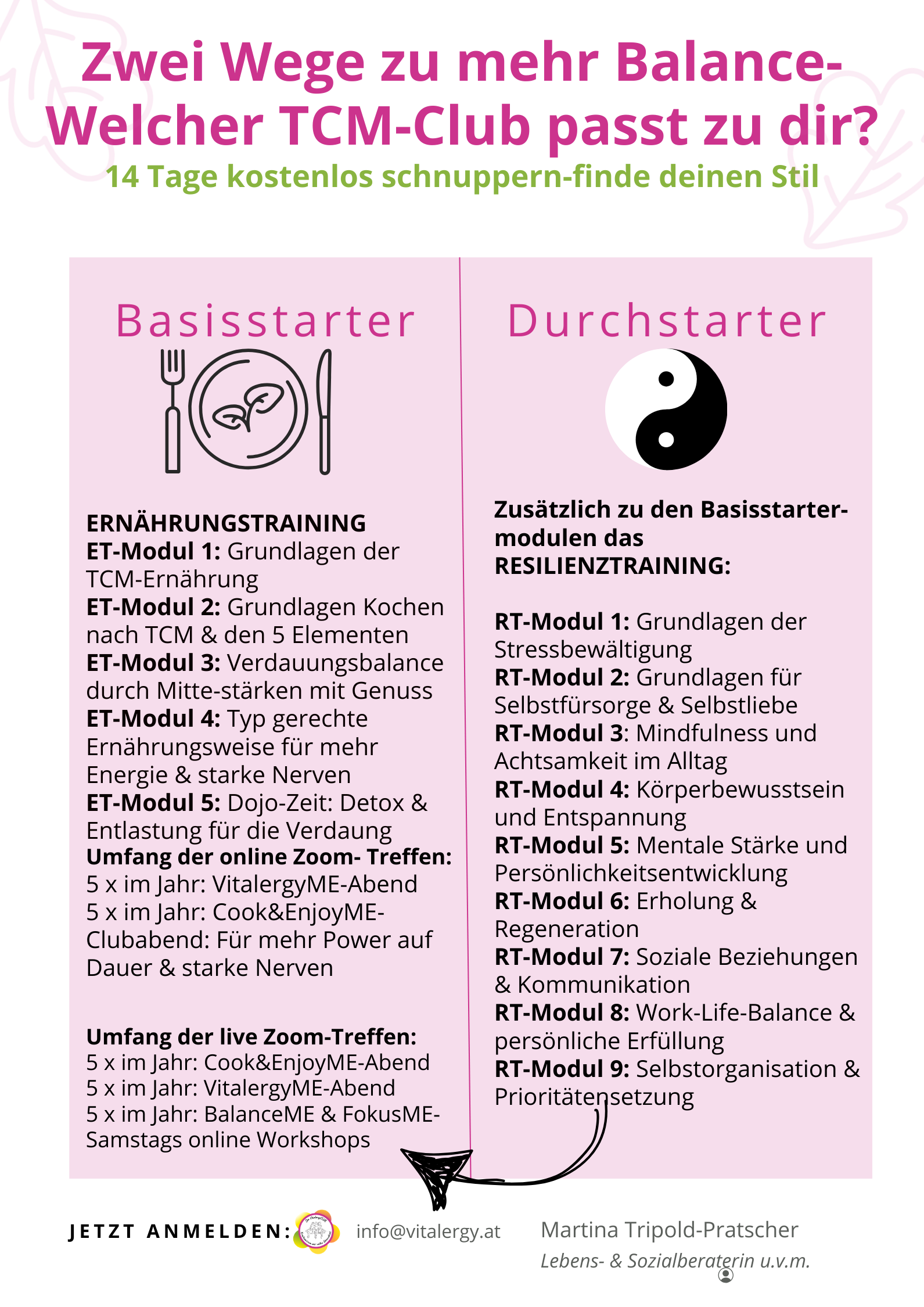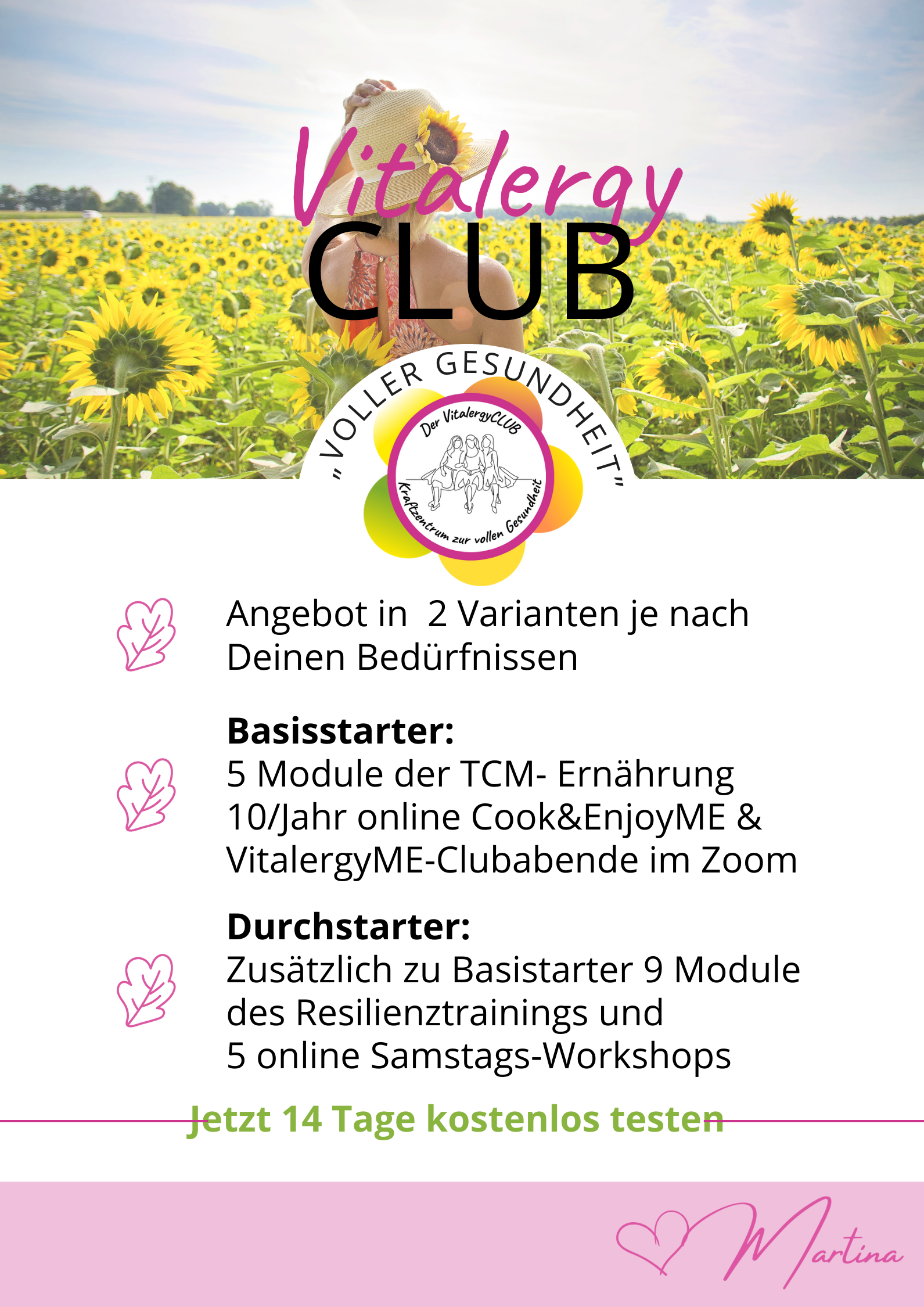 Ich bin Martina, Gründerin dieses Clubs und deine Mentorin auf dem Weg zu einer gestärkten Mitte und ganzheitlichem Wohlbefinden. Nach Jahren des persönlichen und beruflichen Engagements im Bereich der Gesundheitsförderung, insbesondere der traditionellen ☯ chinesischen Medizin (TCM), habe ich meinen Traum verwirklicht: einen Raum zu schaffen, in dem Frauen & Männer wie du die Kraft ihrer eigenen Mitte entdecken und stärken können.